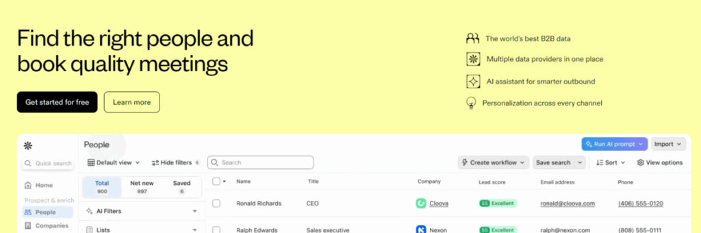 - Apollo.io provides an all-in-one ecosystem, combining a massive B2B database with engagement and CRM-style workflows.